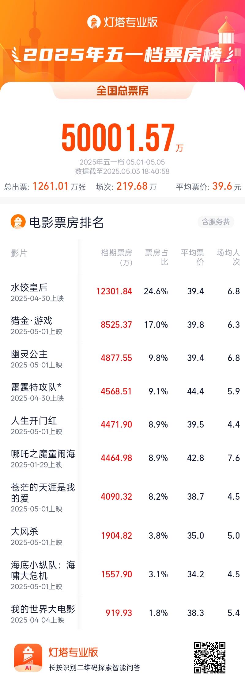 据网络平台数据,截至5月3日18时40分,2025年五一档(5月1日—5月5日)档期内总票房(含预售)突破5亿,影片《水饺皇后》《猎金·游戏》《幽灵公主》暂列前三名。